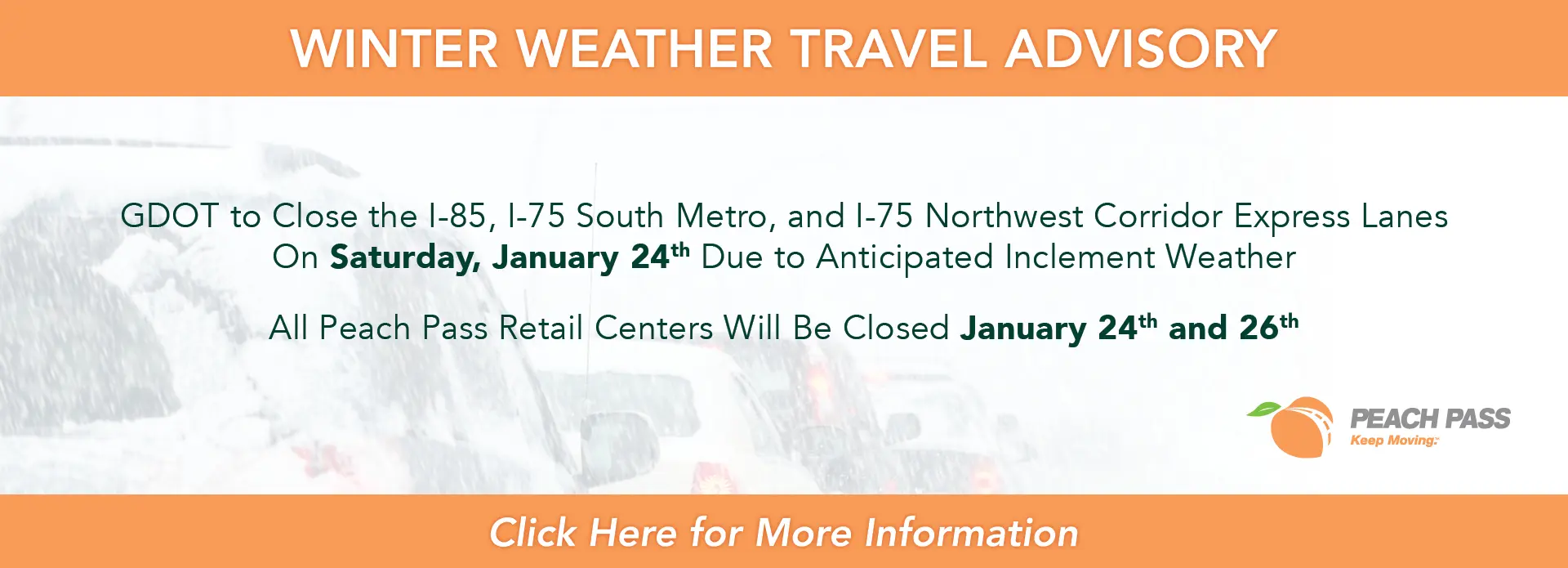 GDOT to Close the I-85, I-75 South Metro, and I-75 Northwest Corridor Express Lanes Saturday, January 24th Due to Anticipated Inclement Weather